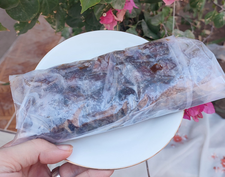اسمشو گذاشتیم لقمه ای چون هر یک لقمه اندازه مصرف یک وعده یک خانواده س. توی پلاستیک ضخیم مخصوص خرما بستهبندی شده و ازش محافظت میکنه. این خرما تمیز و شسته شده و آفتاب خورده و شیره انداخته. نیازی به یخچال نداره و میتونین تو دمای محیط نگهداری کنین. هر بسته حدودا نیم کیلویی هست. هیچ چیزی بهش اضافه نشده و این شیره طبیعی خود خرماست که تحت فشار و گرما به شیره نشسته.